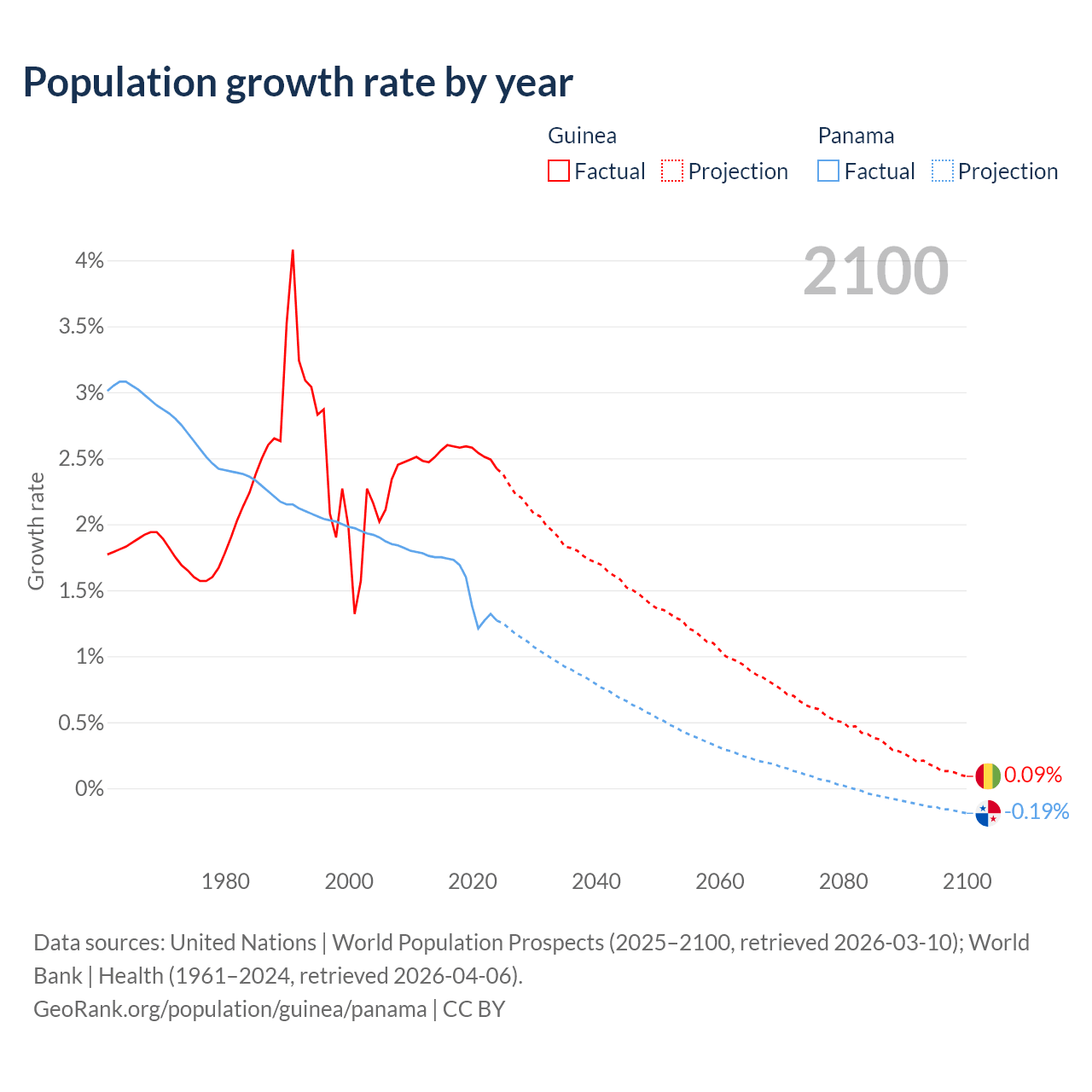 - For the last 10 years, Guinea has had an average growth rate of +2.54% per year vs +1.52% in Panama.