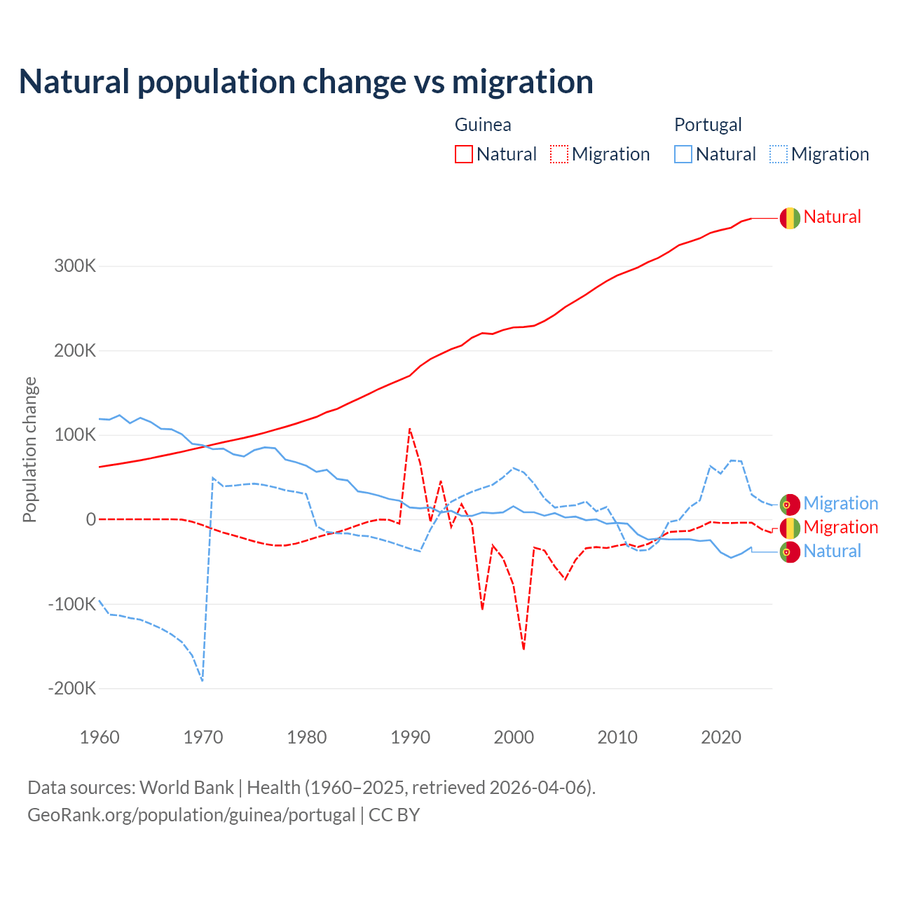 Over the last 10 years, 97.2% of the population change in Guinea is from natural causes (a gain of 3,346,936 people) and 2.76% is from migration (a loss of 94,924 people). In Portugal 51% is from natural causes (a loss of 302,748 people) and 49% is from migration (a gain of 290,554 people).