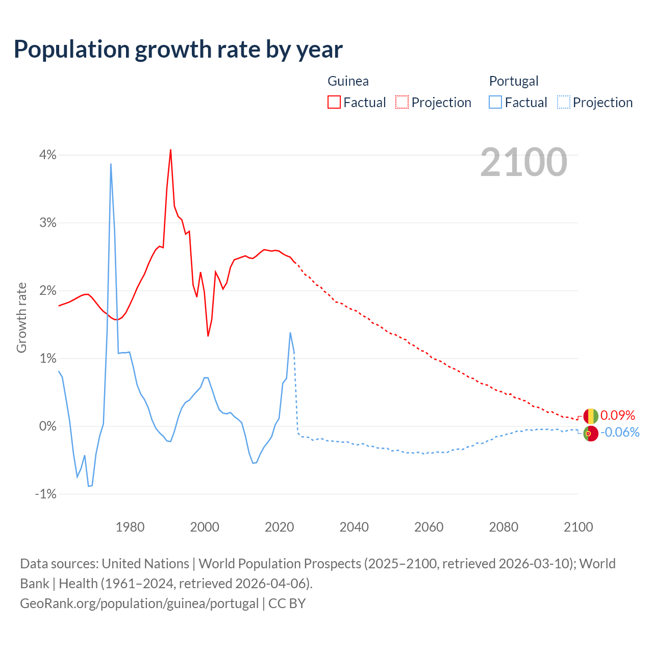 - For the last 10 years, Guinea has had an average growth rate of +2.54% per year vs +0.21% in Portugal.