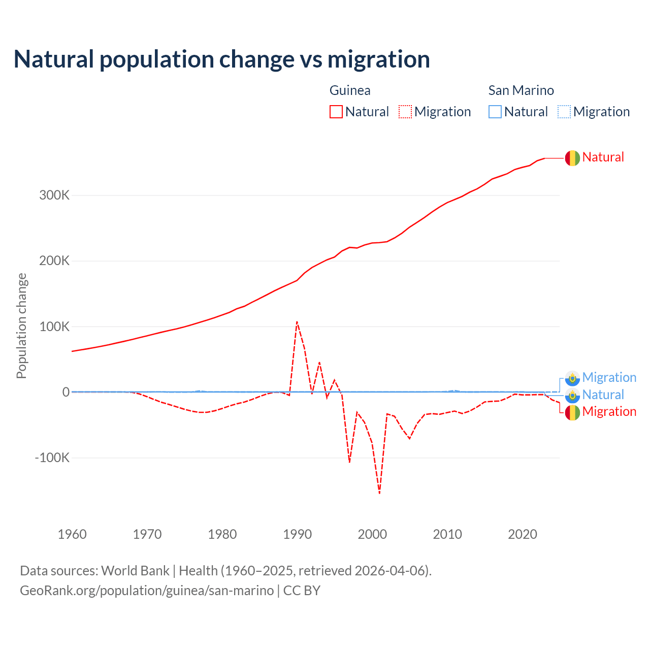Over the last 10 years, 97.2% of the population change in Guinea is from natural causes (a gain of 3,346,936 people) and 2.76% is from migration (a loss of 94,924 people). In San Marino 40.9% is from natural causes (a loss of 358 people) and 59.1% is from migration (a gain of 517 people).