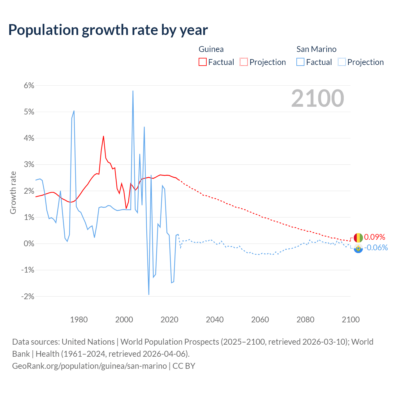 - For the last 10 years, Guinea has had an average growth rate of +2.54% per year vs +0.26% in San Marino.