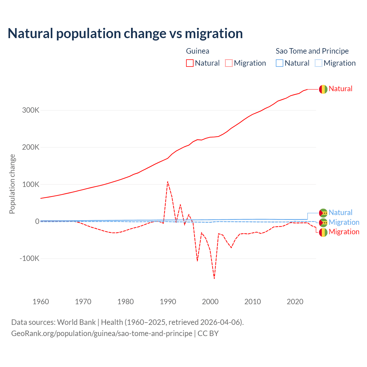 Over the last 10 years, 97.2% of the population change in Guinea is from natural causes (a gain of 3,346,936 people) and 2.76% is from migration (a loss of 94,924 people). In Sao Tome and Principe 80.1% is from natural causes (a gain of 50,822 people) and 19.9% is from migration (a loss of 12,621 people).