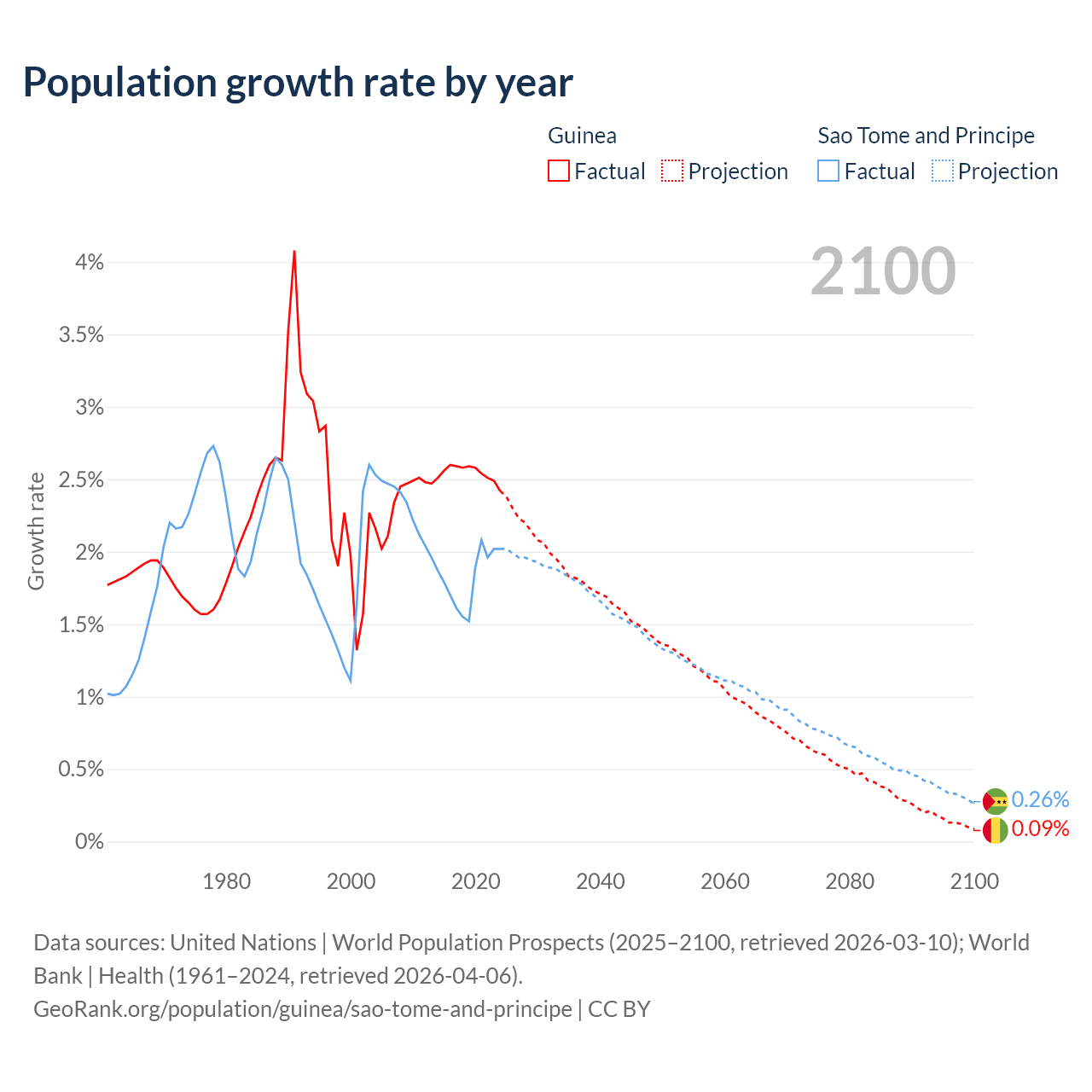 - For the last 10 years, Guinea has had an average growth rate of +2.54% per year vs +1.82% in Sao Tome and Principe.