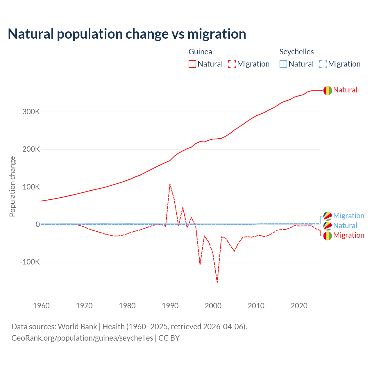 Over the last 10 years, 97.2% of the population change in Guinea is from natural causes (a gain of 3,346,936 people) and 2.76% is from migration (a loss of 94,924 people). In the Seychelles 31.4% is from natural causes (a gain of 8,122 people) and 68.6% is from migration (a gain of 17,748 people).