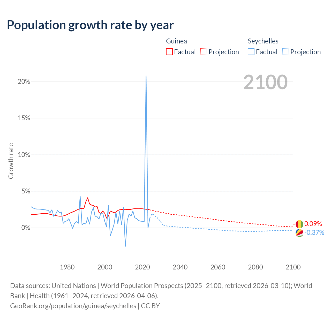 - For the last 10 years, Guinea has had an average growth rate of +2.54% per year vs +2.9% in the Seychelles.