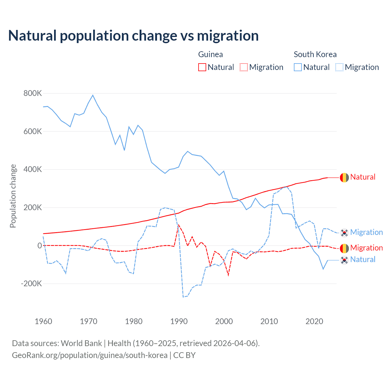Over the last 10 years, 97.2% of the population change in Guinea is from natural causes (a gain of 3,346,936 people) and 2.76% is from migration (a loss of 94,924 people). In South Korea 17.6% is from natural causes (a gain of 277,215 people) and 82.4% is from migration (a gain of 1,298,356 people).