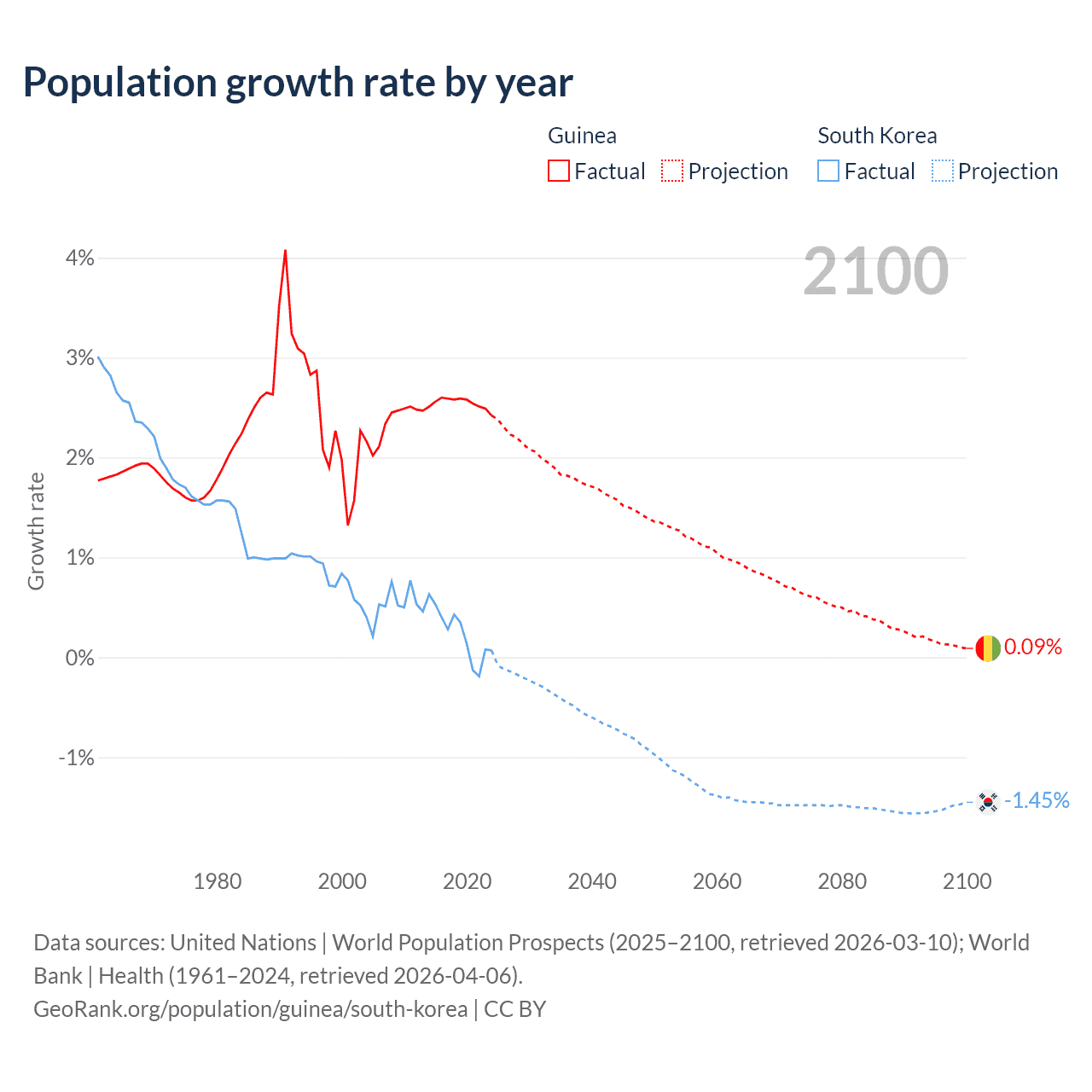 - For the last 10 years, Guinea has had an average growth rate of +2.54% per year vs +0.24% in South Korea.