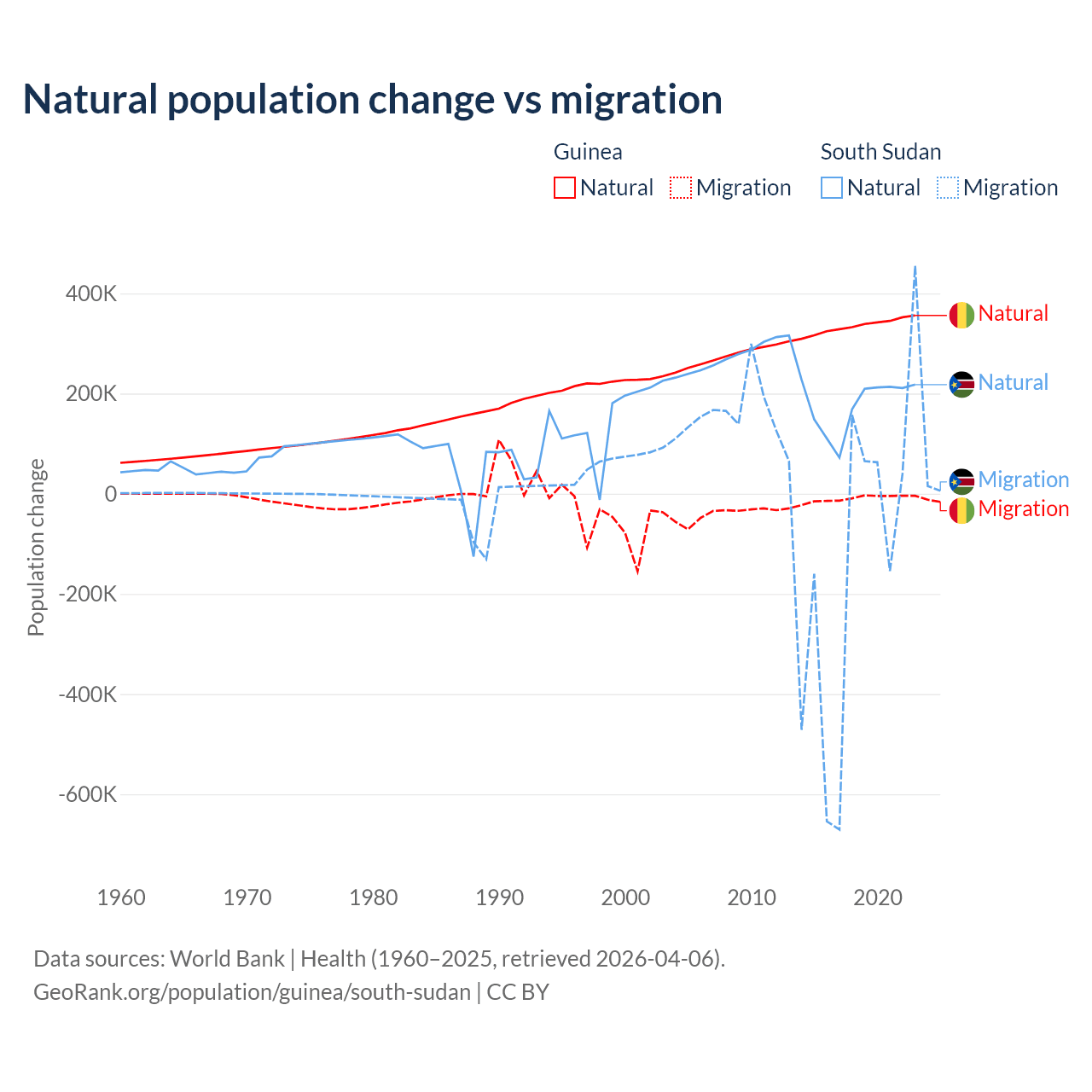 Over the last 10 years, 97.2% of the population change in Guinea is from natural causes (a gain of 3,346,936 people) and 2.76% is from migration (a loss of 94,924 people). In South Sudan 57.4% is from natural causes (a gain of 1,792,135 people) and 42.6% is from migration (a loss of 1,329,606 people).
