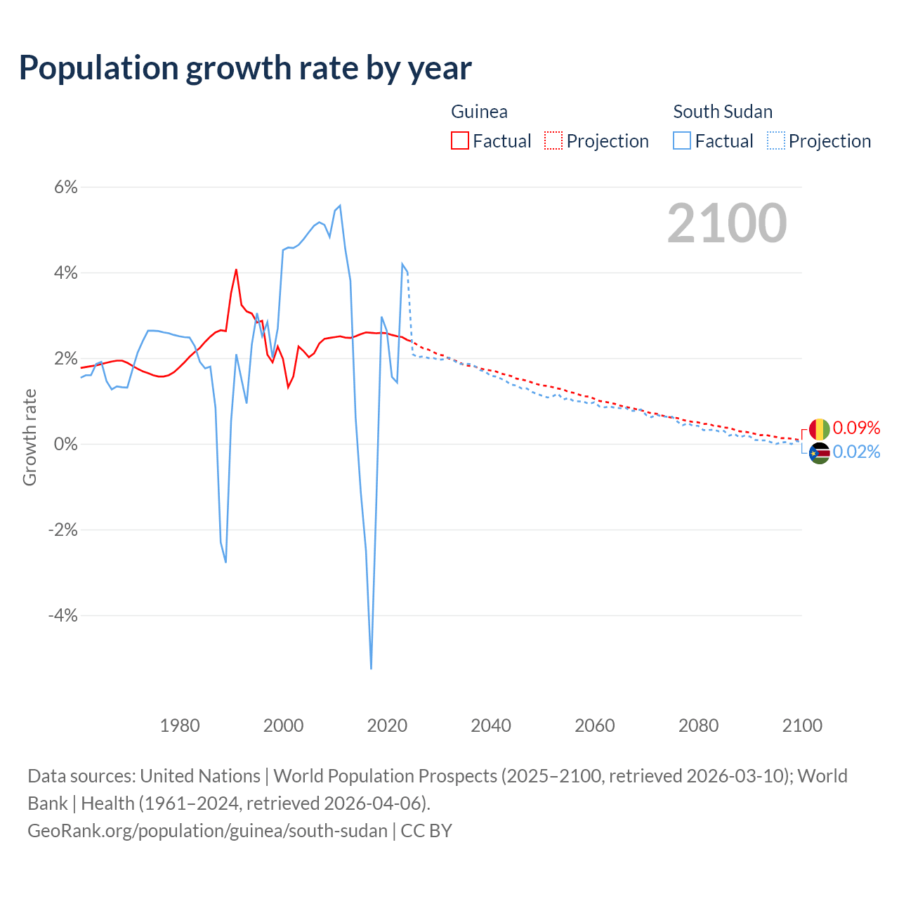 - For the last 10 years, Guinea has had an average growth rate of +2.54% per year vs +0.65% in South Sudan.