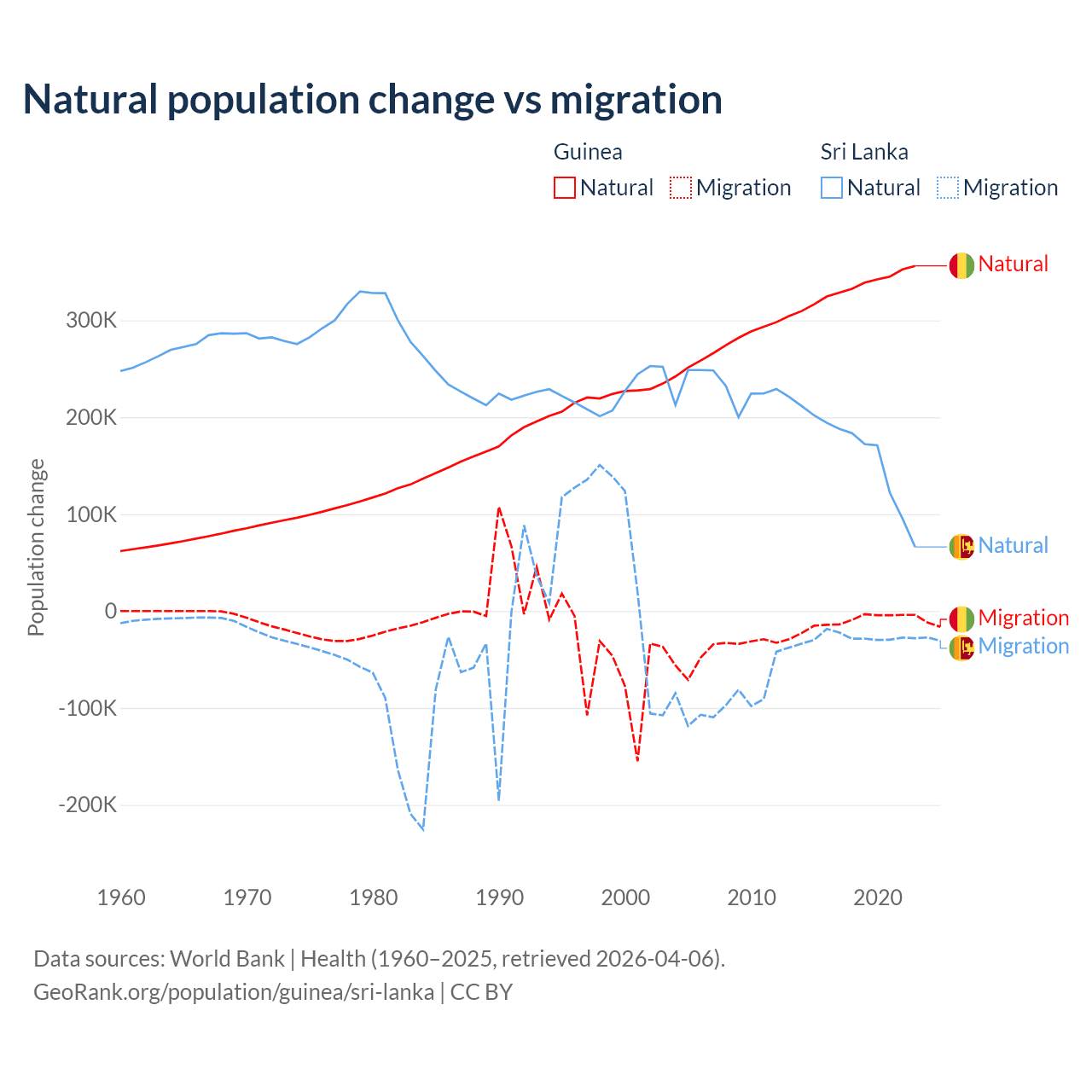 Over the last 10 years, 97.2% of the population change in Guinea is from natural causes (a gain of 3,346,936 people) and 2.76% is from migration (a loss of 94,924 people). In Sri Lanka 85.3% is from natural causes (a gain of 1,605,749 people) and 14.7% is from migration (a loss of 276,121 people).