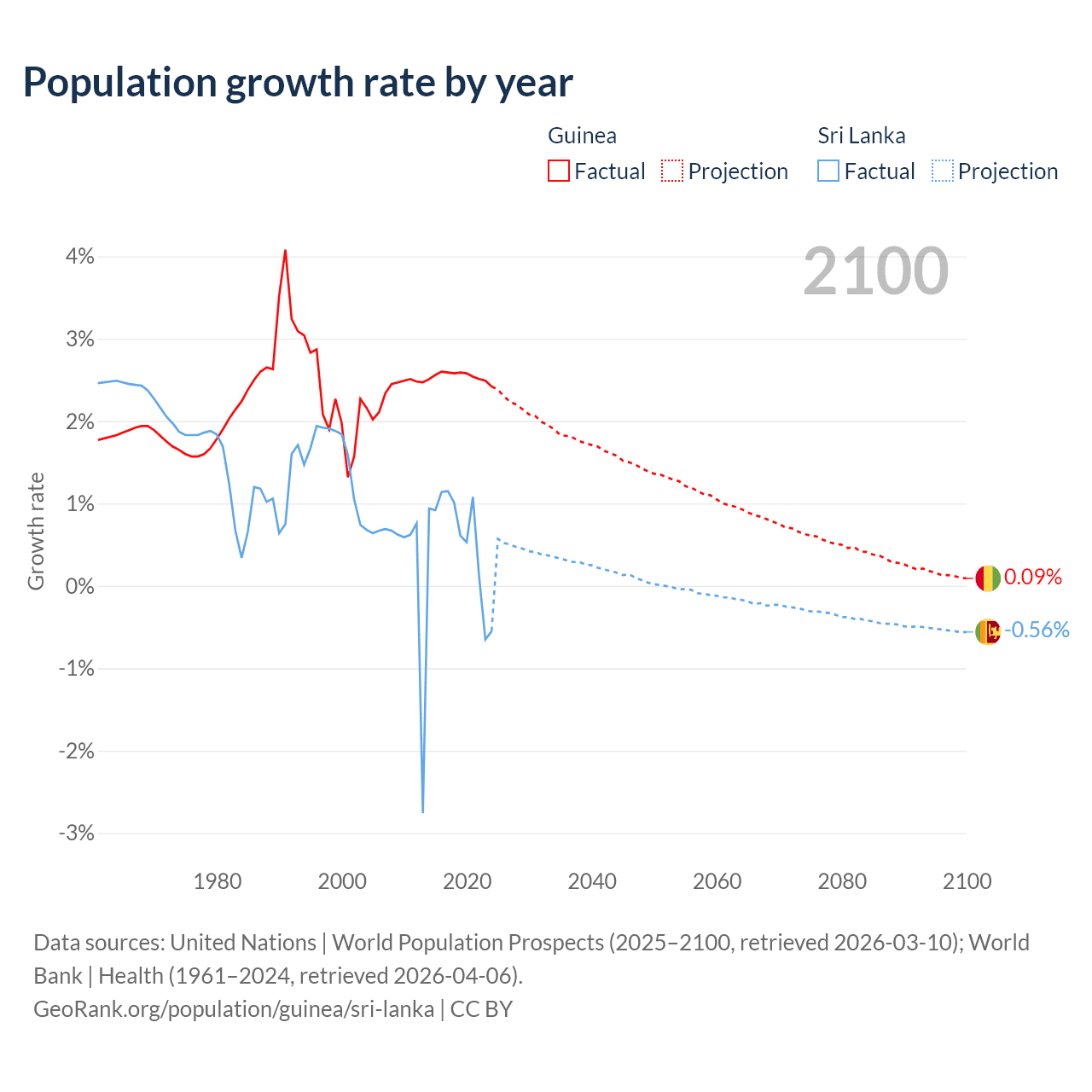 - For the last 10 years, Guinea has had an average growth rate of +2.54% per year vs +0.57% in Sri Lanka.