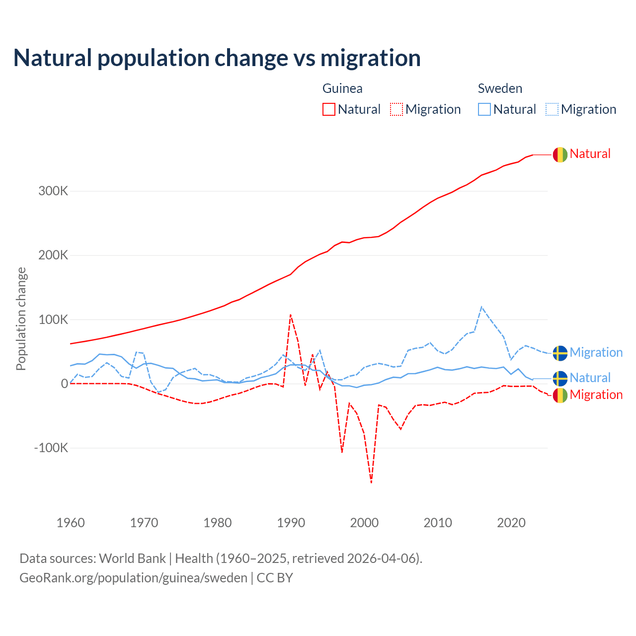 Over the last 10 years, 97.2% of the population change in Guinea is from natural causes (a gain of 3,346,936 people) and 2.76% is from migration (a loss of 94,924 people). In Sweden 21.4% is from natural causes (a gain of 201,900 people) and 78.6% is from migration (a gain of 743,642 people).