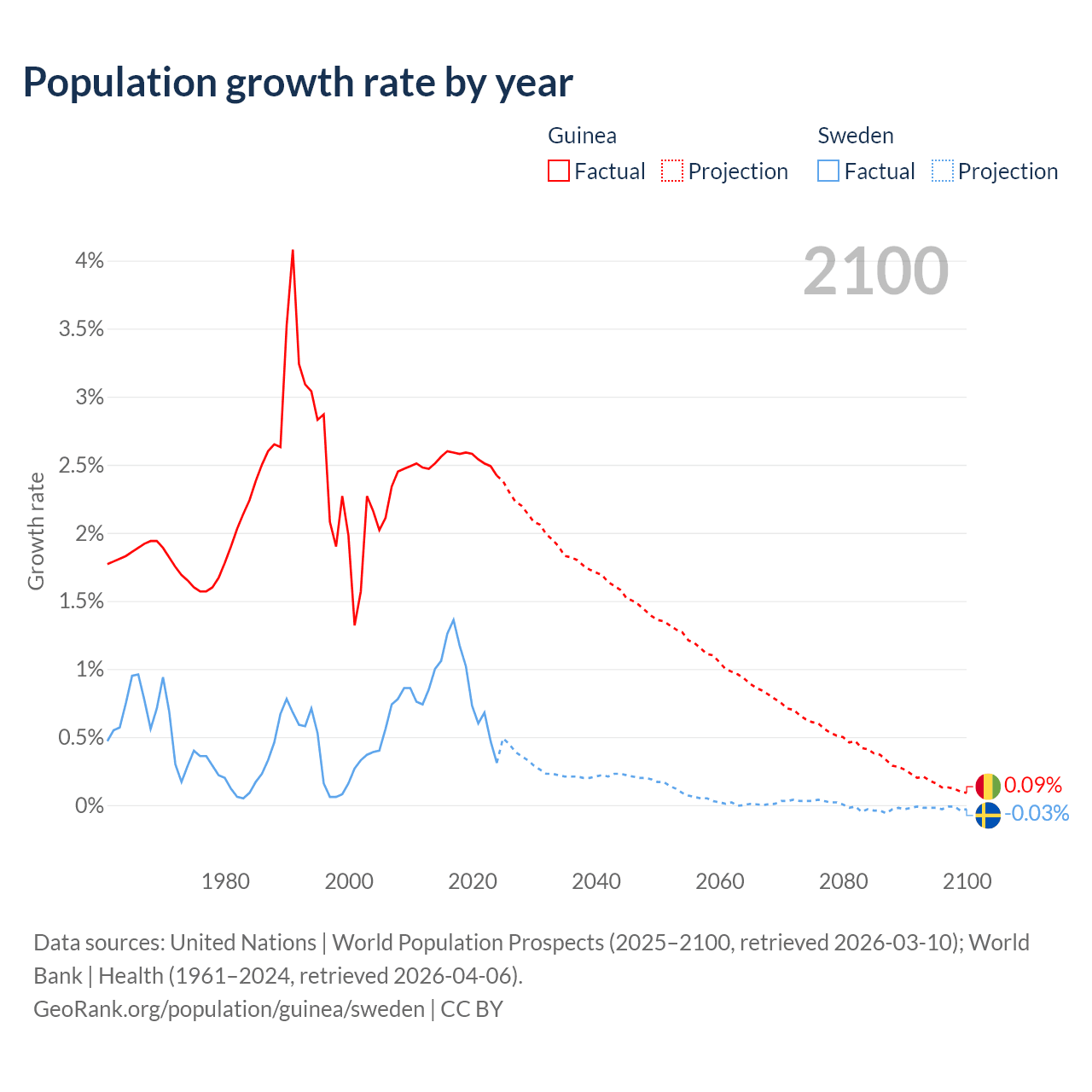 - For the last 10 years, Guinea has had an average growth rate of +2.54% per year vs +0.88% in Sweden.