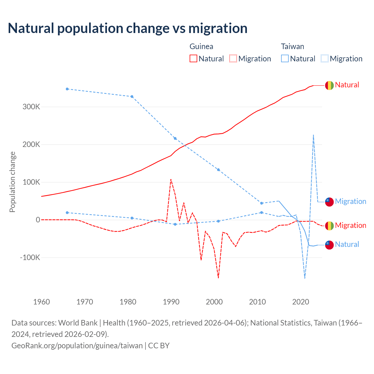 Over the last 10 years, 97.2% of the population change in Guinea is from natural causes (a gain of 3,346,936 people) and 2.76% is from migration (a loss of 94,924 people). In Taiwan 56.7% is from natural causes (a loss of 57,467 people) and 43.3% is from migration (a gain of 43,884 people).