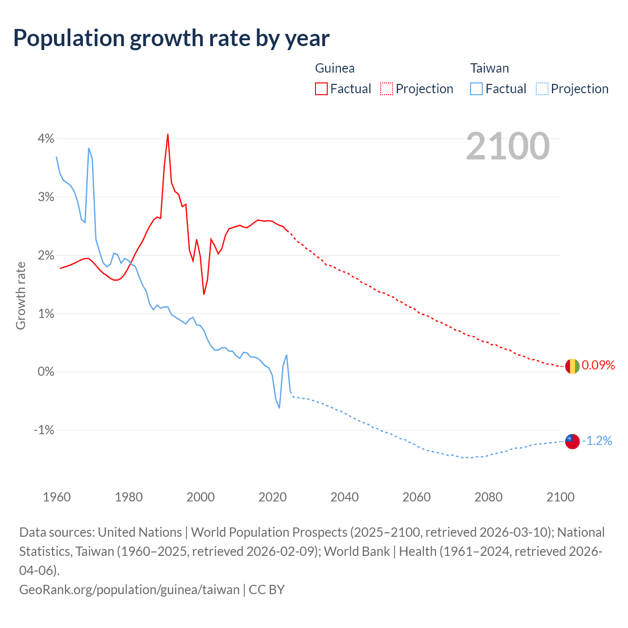 Data sources: World Bank | Health (1960–2024, retrieved 2026-04-06); United Nations | World Population Prospects (1960–2026, retrieved 2026-03-10); U.S. Census Bureau (1960–2025, retrieved 2026-02-08); National Statistics, Taiwan (1960–2025, retrieved 2026-02-09); Central Intelligence Agency (CIA) (2000–2019, retrieved 2026-02-20).