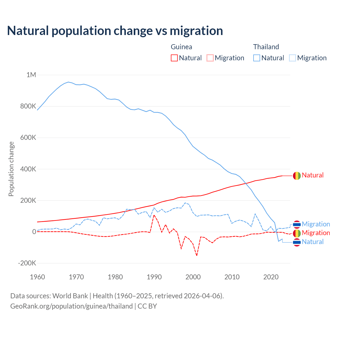 Over the last 10 years, 97.2% of the population change in Guinea is from natural causes (a gain of 3,346,936 people) and 2.76% is from migration (a loss of 94,924 people). In Thailand 78.4% is from natural causes (a gain of 1,292,528 people) and 21.6% is from migration (a gain of 355,361 people).