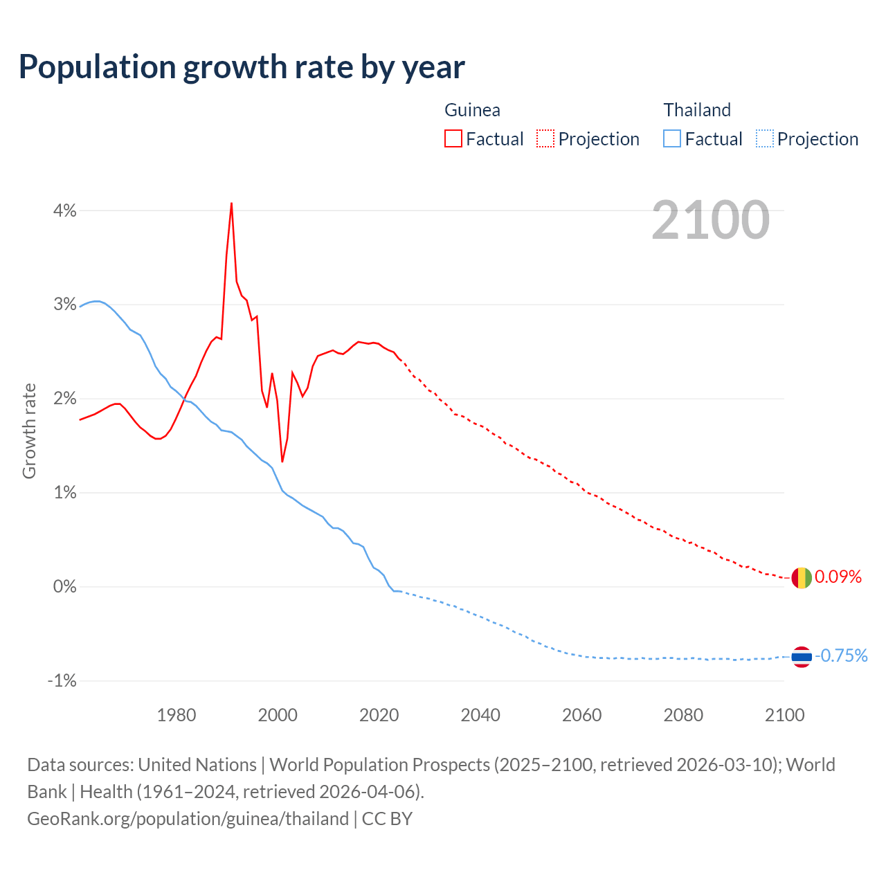 - For the last 10 years, Guinea has had an average growth rate of +2.54% per year vs +0.23% in Thailand.