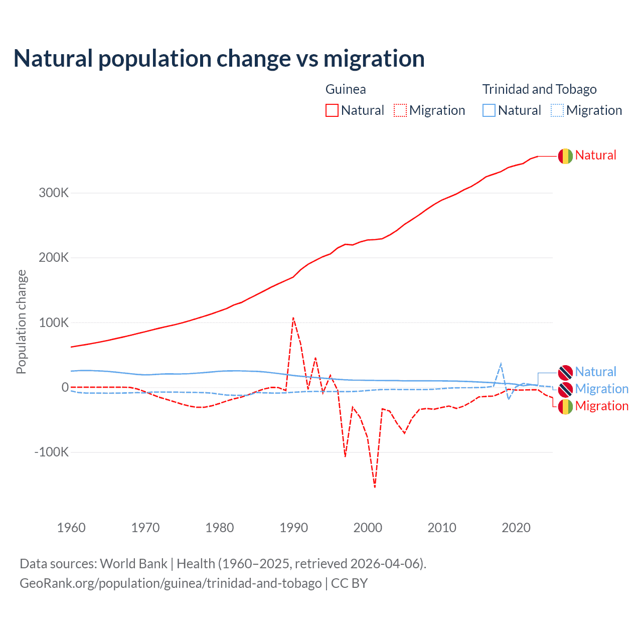 Over the last 10 years, 97.2% of the population change in Guinea is from natural causes (a gain of 3,346,936 people) and 2.76% is from migration (a loss of 94,924 people). In Trinidad and Tobago 66% is from natural causes (a gain of 55,887 people) and 34% is from migration (a gain of 28,785 people).