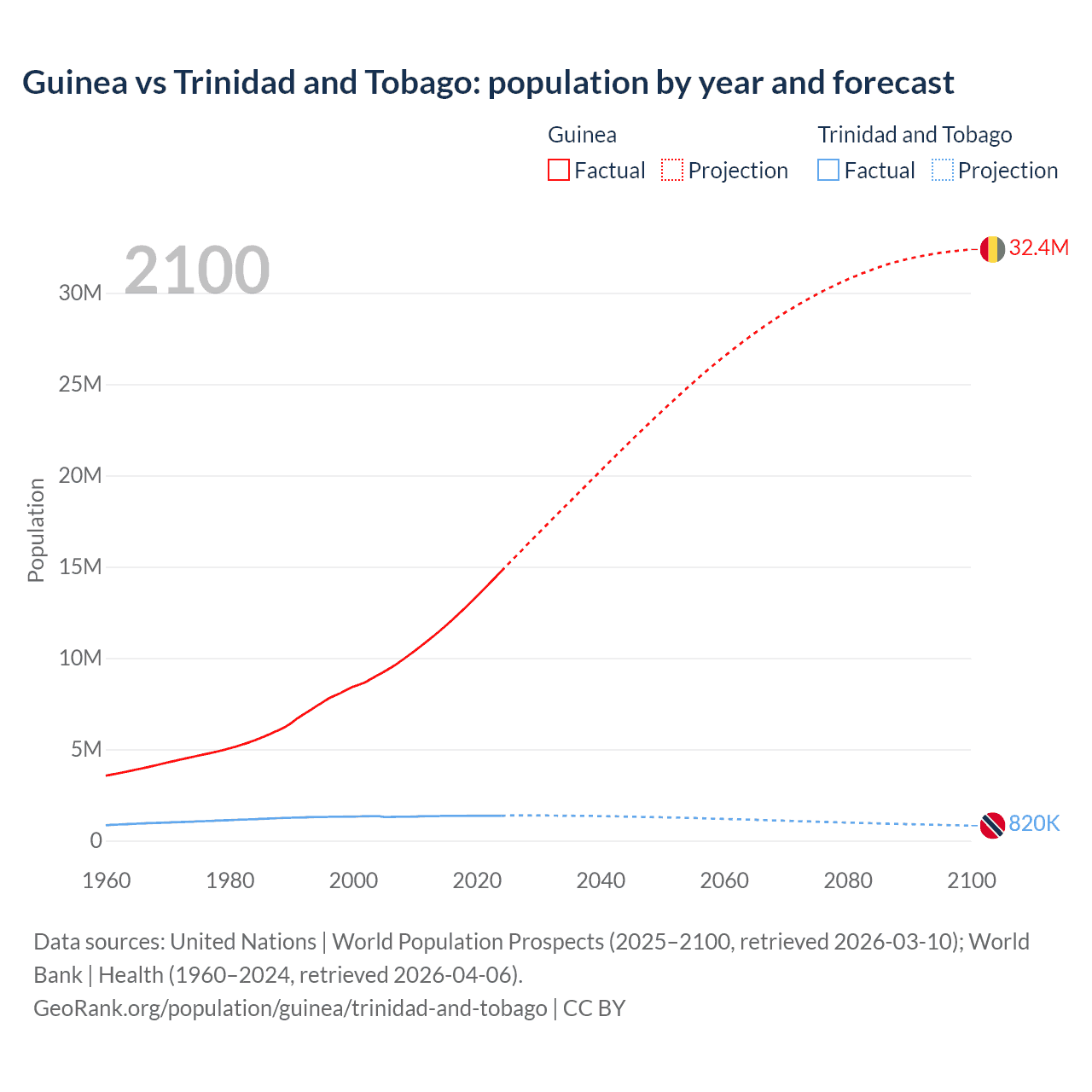 The latest officially reported population of Guinea was 14,754,785 in 2024 vs 1,368,333 people in Trinidad and Tobago in 2024. In 2026, based on the adjusted UN estimation, the current Guinea's population is 15,546,235 people compared to 1,374,840 in Trinidad and Tobago.
