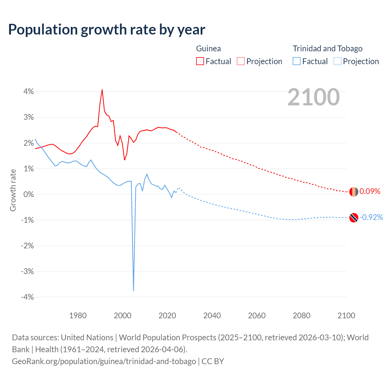 - For the last 10 years, Guinea has had an average growth rate of +2.54% per year vs +0.19% in Trinidad and Tobago.