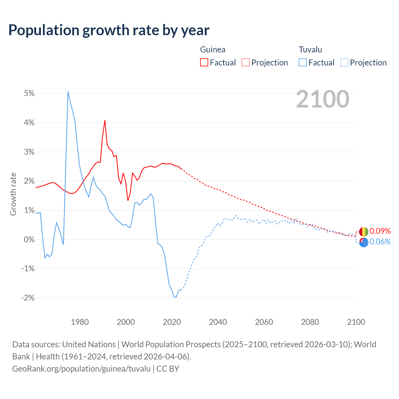 - For the last 10 years, Guinea has had an average growth rate of +2.54% per year vs -1.19% in Tuvalu.