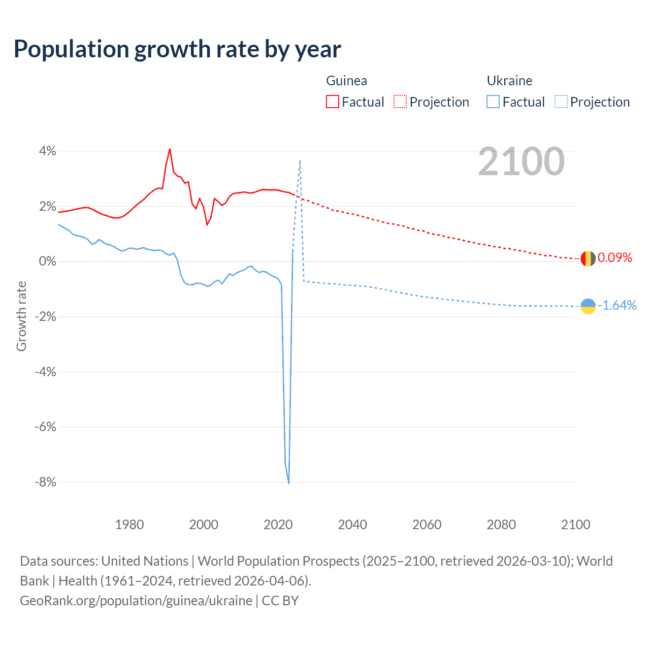 - For the last 10 years, Guinea has had an average growth rate of +2.54% per year vs -1.74% in Ukraine.