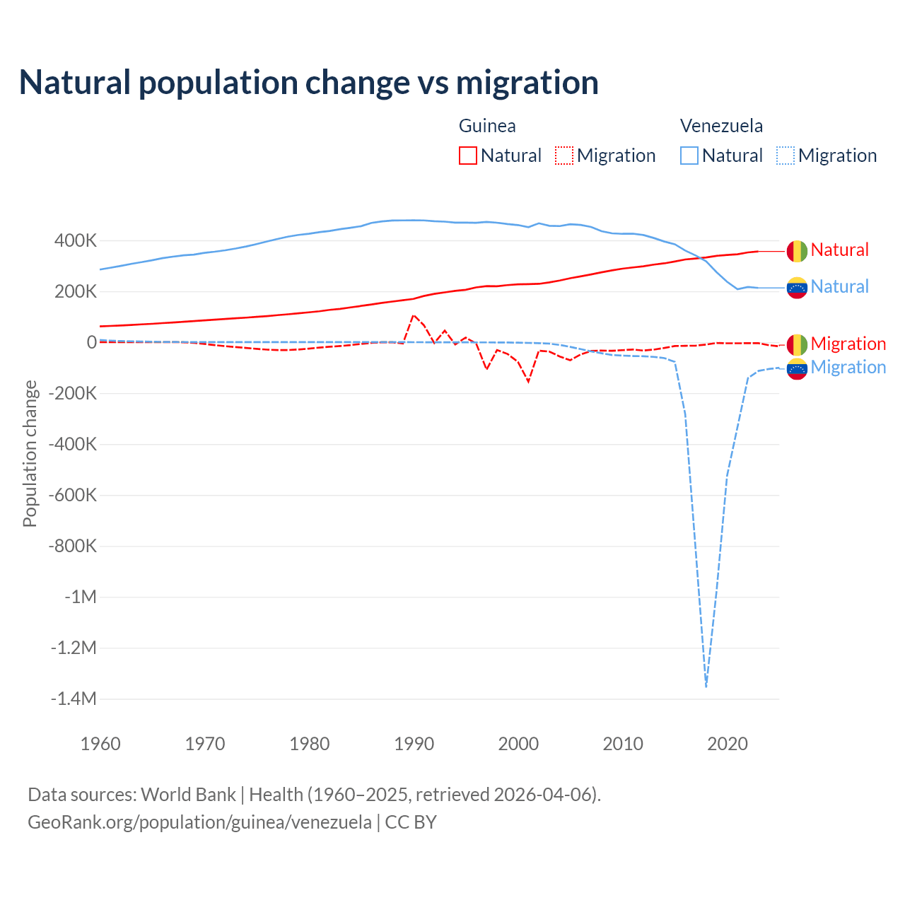 Over the last 10 years, 97.2% of the population change in Guinea is from natural causes (a gain of 3,346,936 people) and 2.76% is from migration (a loss of 94,924 people). In Venezuela 38.6% is from natural causes (a gain of 2,946,257 people) and 61.4% is from migration (a loss of 4,683,227 people).
