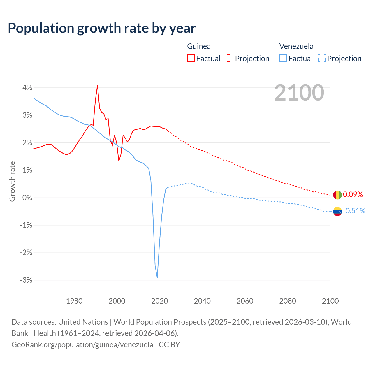 - For the last 10 years, Guinea has had an average growth rate of +2.54% per year vs -0.46% in Venezuela.