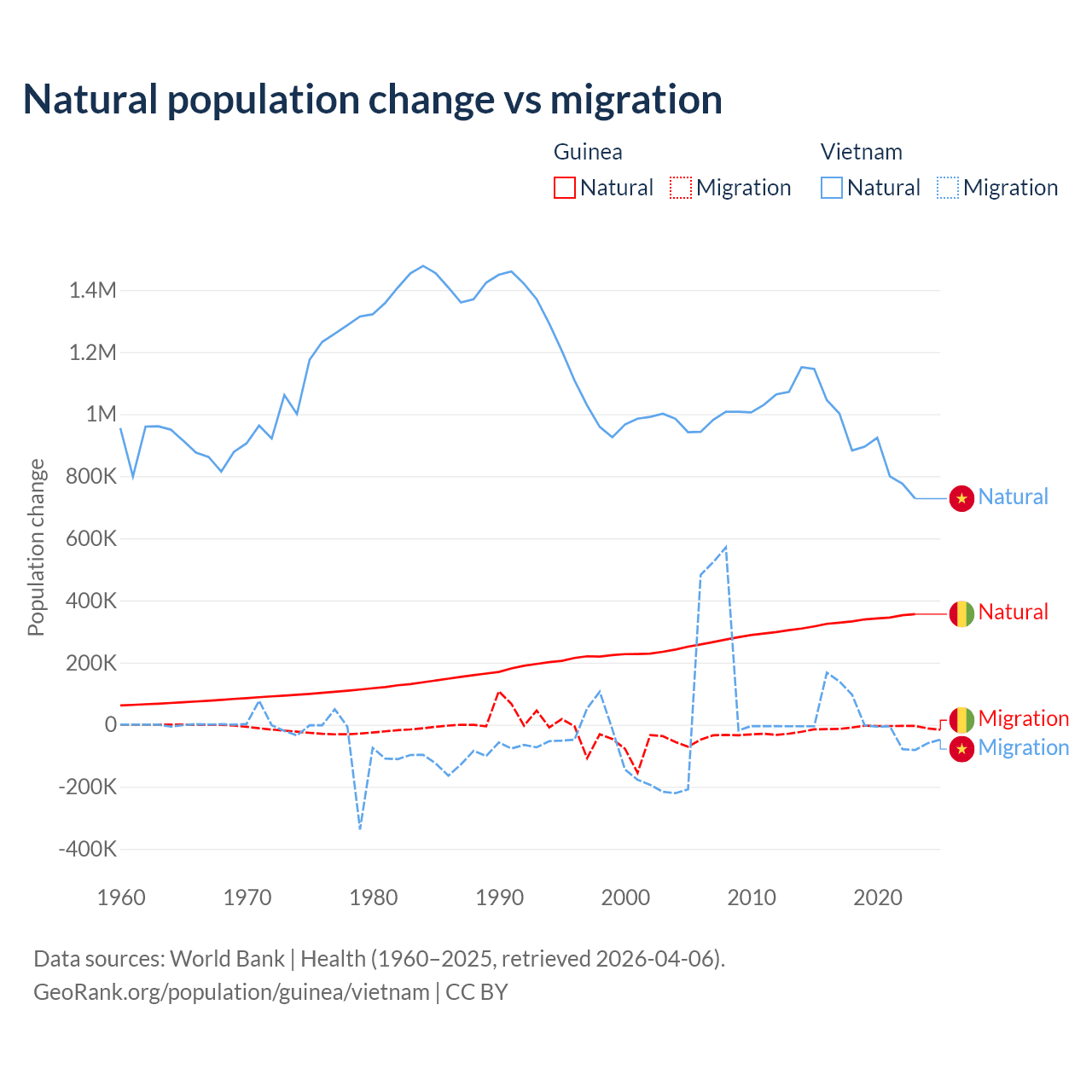 Over the last 10 years, 97.2% of the population change in Guinea is from natural causes (a gain of 3,346,936 people) and 2.76% is from migration (a loss of 94,924 people). In Vietnam 97.7% is from natural causes (a gain of 9,349,756 people) and 2.29% is from migration (a gain of 219,073 people).
