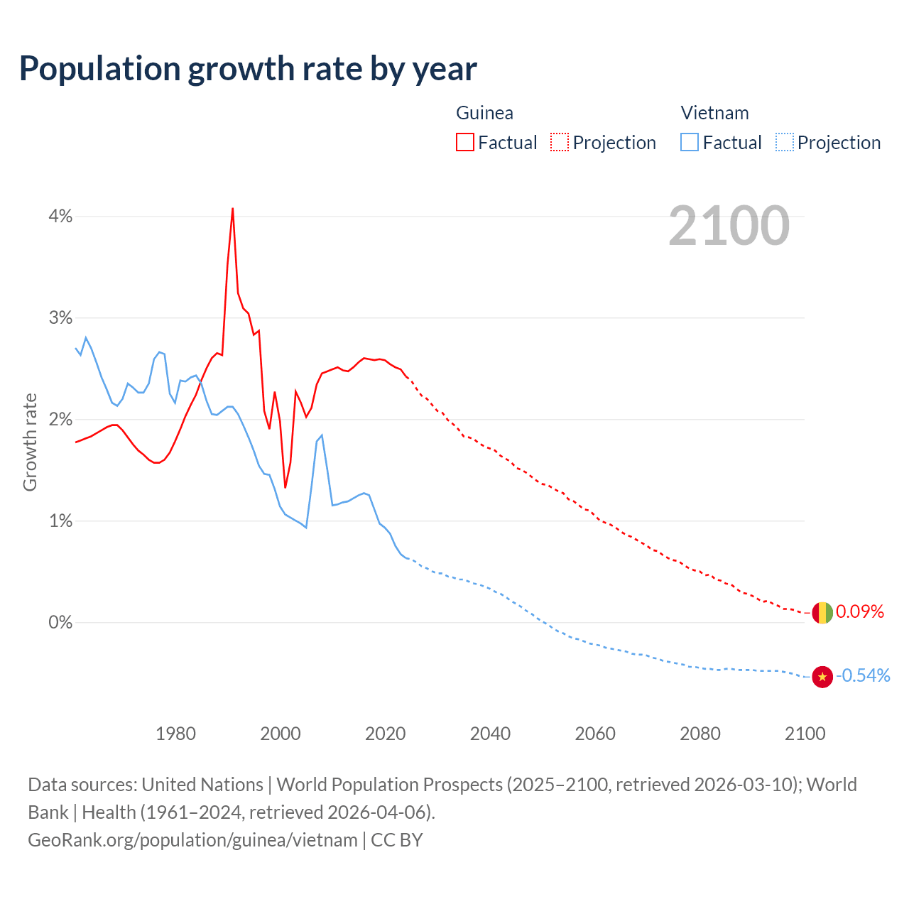 - For the last 10 years, Guinea has had an average growth rate of +2.54% per year vs +0.99% in Vietnam.