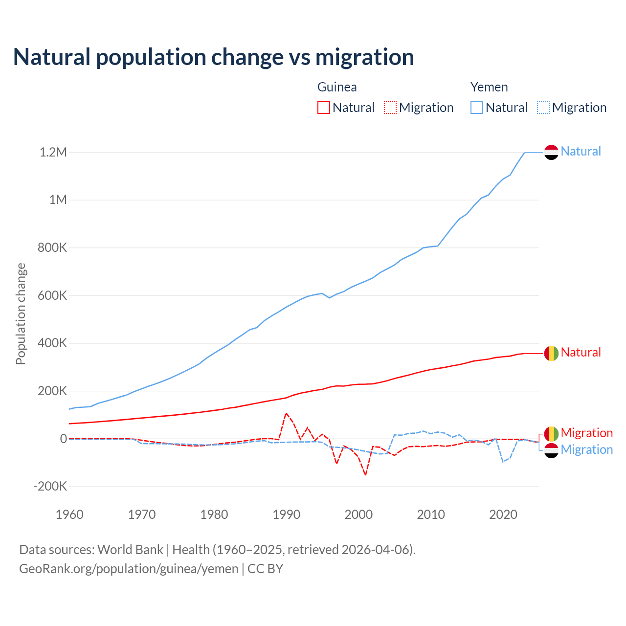 Over the last 10 years, 97.2% of the population change in Guinea is from natural causes (a gain of 3,346,936 people) and 2.76% is from migration (a loss of 94,924 people). In Yemen 97.8% is from natural causes (a gain of 10,460,813 people) and 2.17% is from migration (a loss of 231,814 people).