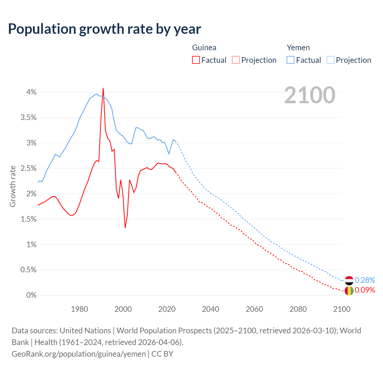 - For the last 10 years, Guinea has had an average growth rate of +2.54% per year vs +3% in Yemen.