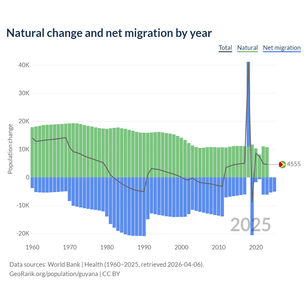 Over the last 10 years, 77.7% of the population change in Guyana is from natural causes (a gain of 107,419 people) and 22.3% is from migration (a loss of 30,797 people).