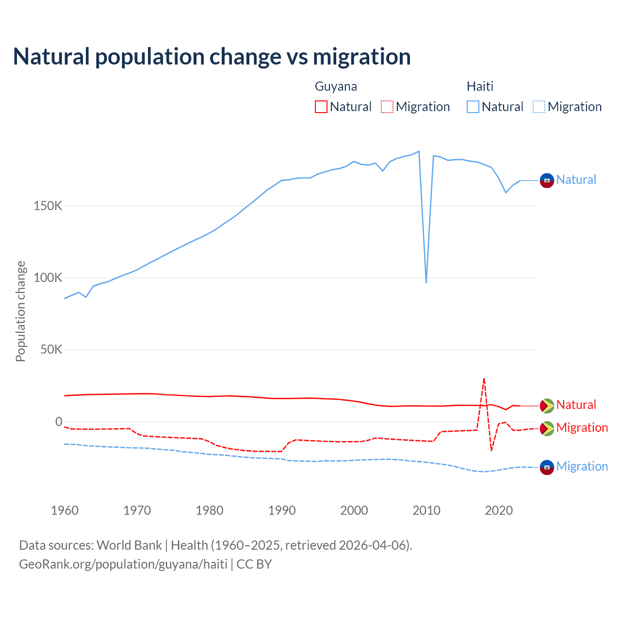 Over the last 10 years, 77.7% of the population change in Guyana is from natural causes (a gain of 107,419 people) and 22.3% is from migration (a loss of 30,797 people). In Haiti 83.9% is from natural causes (a gain of 1,740,319 people) and 16.1% is from migration (a loss of 333,076 people).