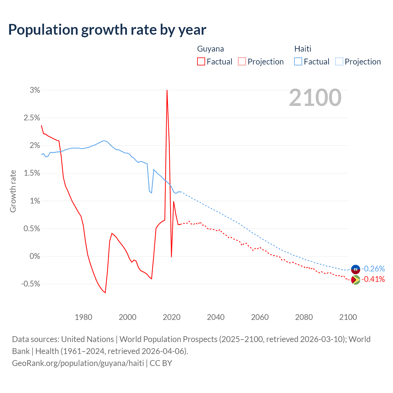 - For the last 10 years, Guyana has had an average growth rate of +0.94% per year vs +1.29% in Haiti.