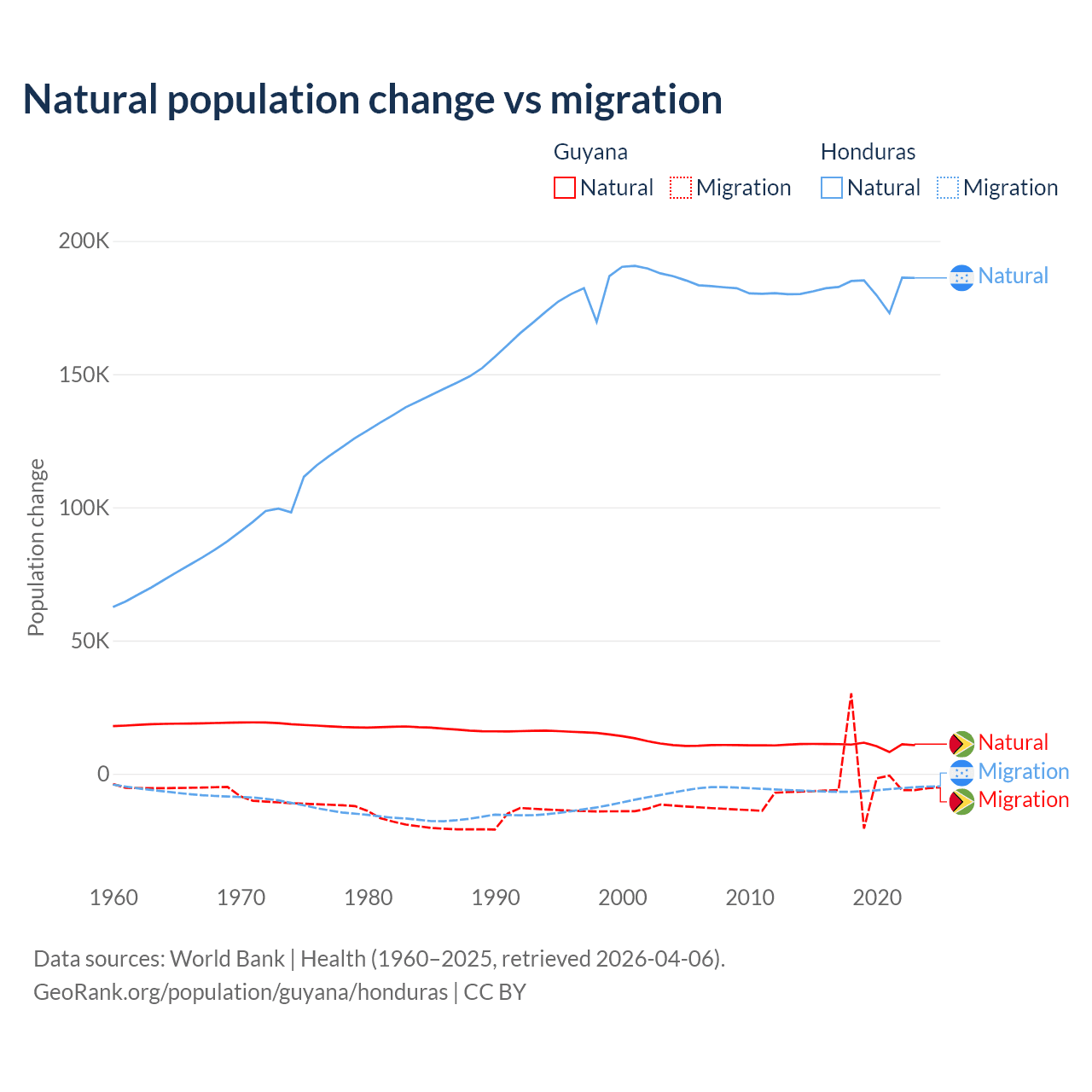 Over the last 10 years, 77.7% of the population change in Guyana is from natural causes (a gain of 107,419 people) and 22.3% is from migration (a loss of 30,797 people). In Honduras 96.7% is from natural causes (a gain of 1,821,125 people) and 3.29% is from migration (a loss of 61,965 people).