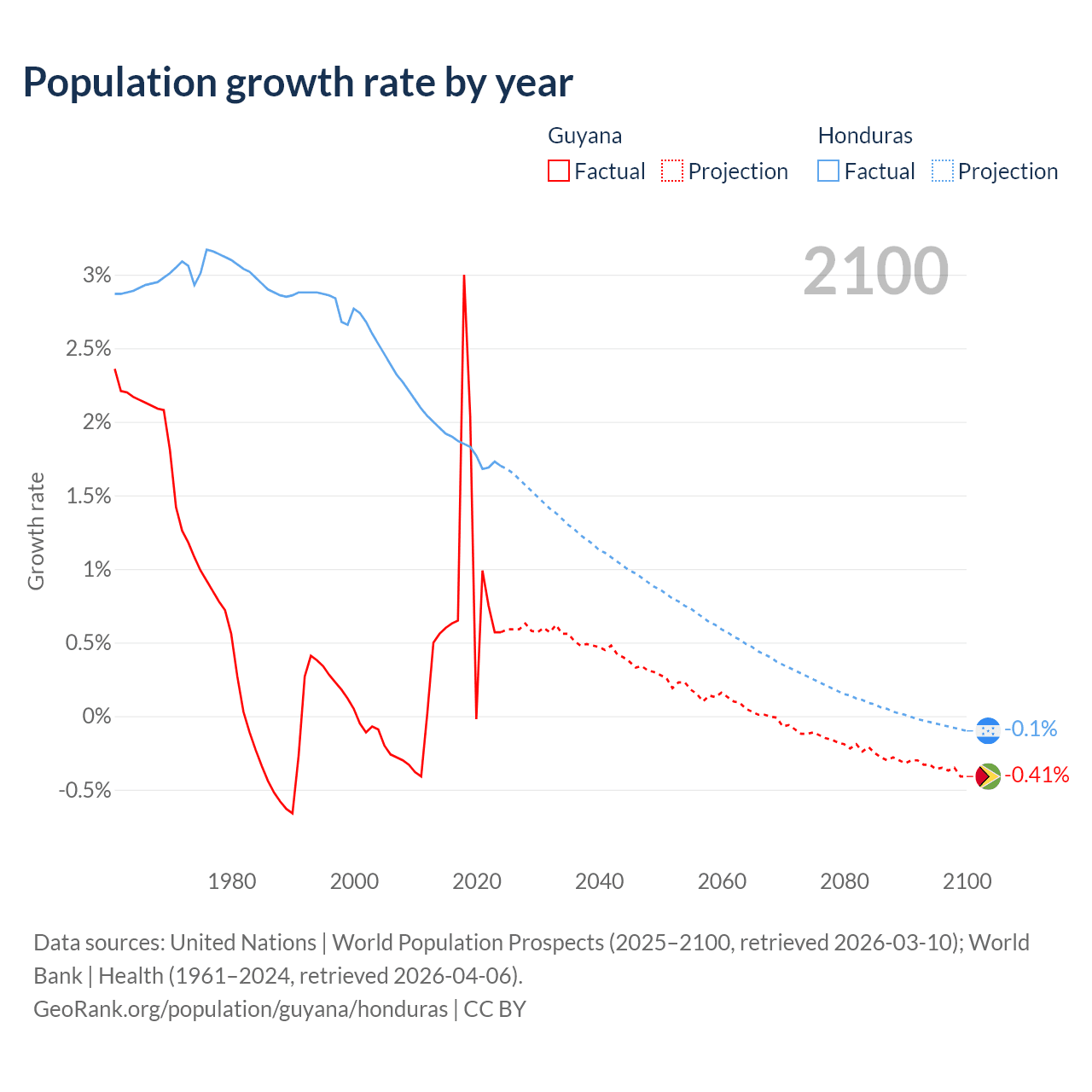 - For the last 10 years, Guyana has had an average growth rate of +0.94% per year vs +1.81% in Honduras.