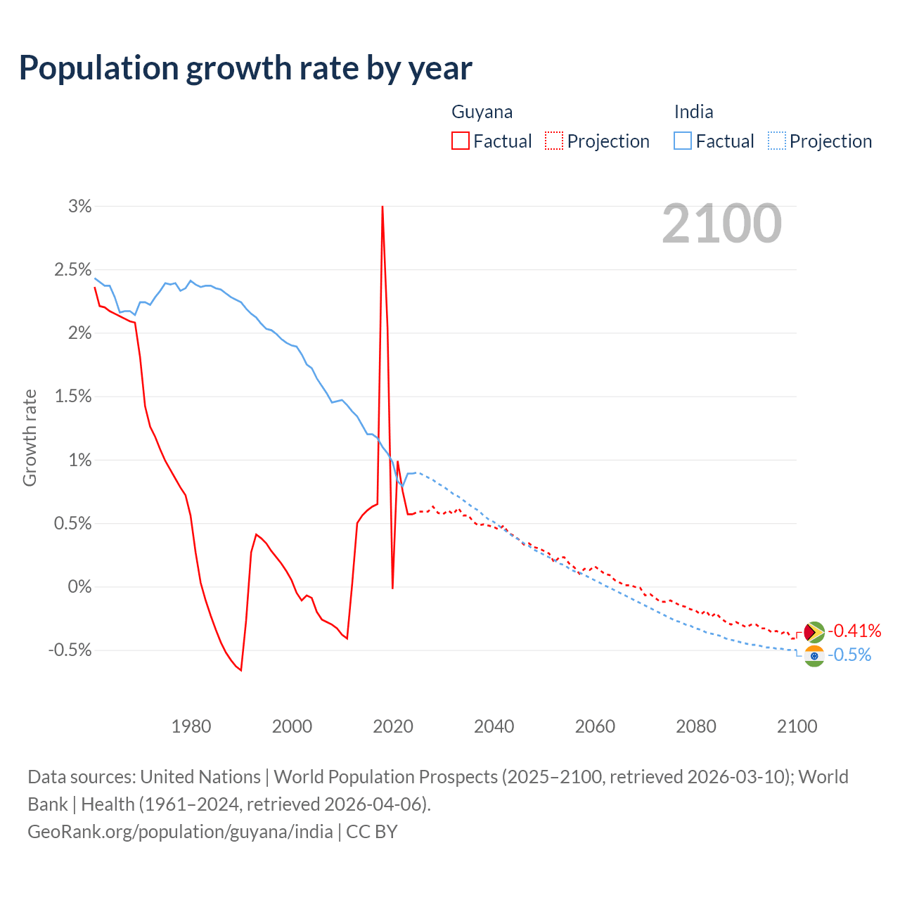 - For the last 10 years, Guyana has had an average growth rate of +0.94% per year vs +1.03% in India.
