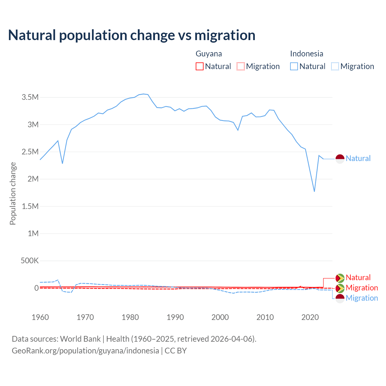 Over the last 10 years, 77.7% of the population change in Guyana is from natural causes (a gain of 107,419 people) and 22.3% is from migration (a loss of 30,797 people). In Indonesia 98.9% is from natural causes (a gain of 25,242,860 people) and 1.1% is from migration (a loss of 280,258 people).