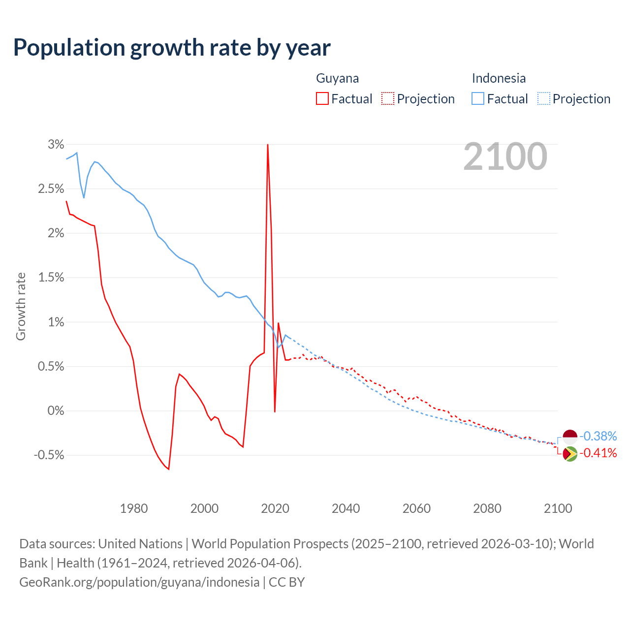 - For the last 10 years, Guyana has had an average growth rate of +0.94% per year vs +0.94% in Indonesia.