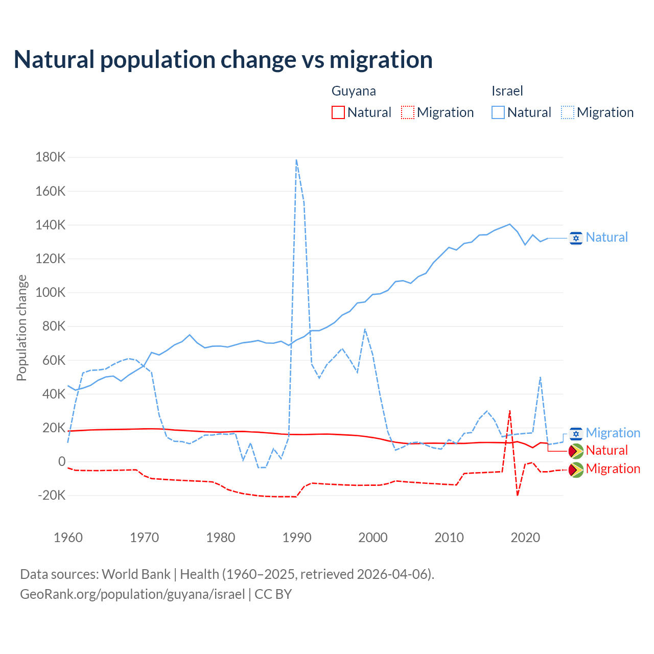 Over the last 10 years, 77.7% of the population change in Guyana is from natural causes (a gain of 107,419 people) and 22.3% is from migration (a loss of 30,797 people). In Israel 86% is from natural causes (a gain of 1,343,492 people) and 14% is from migration (a gain of 219,048 people).