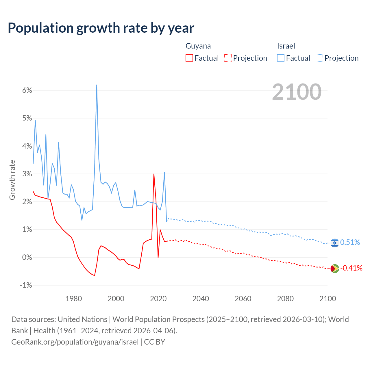 - For the last 10 years, Guyana has had an average growth rate of +0.94% per year vs +1.96% in Israel.