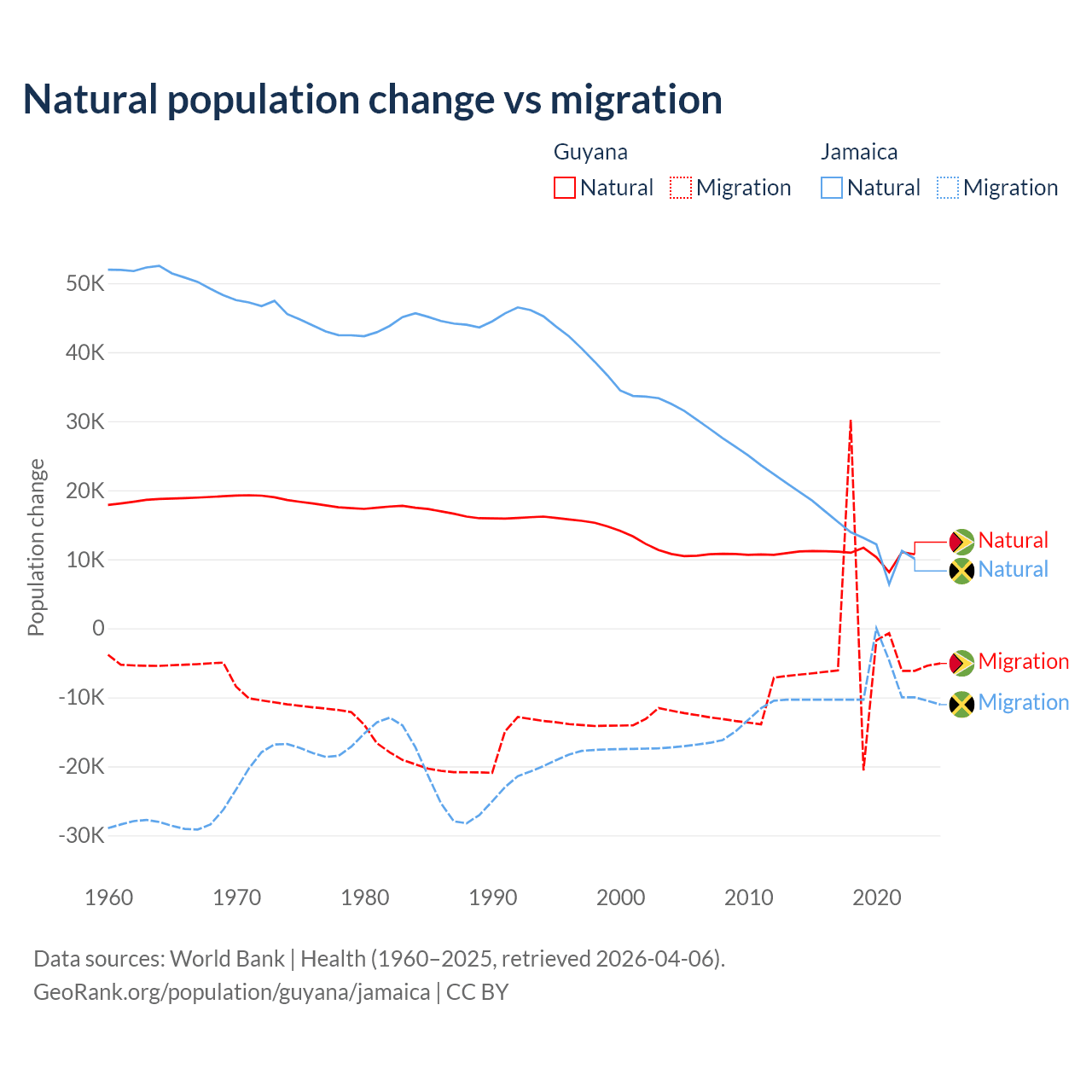 Population differences between Guyana and Jamaica