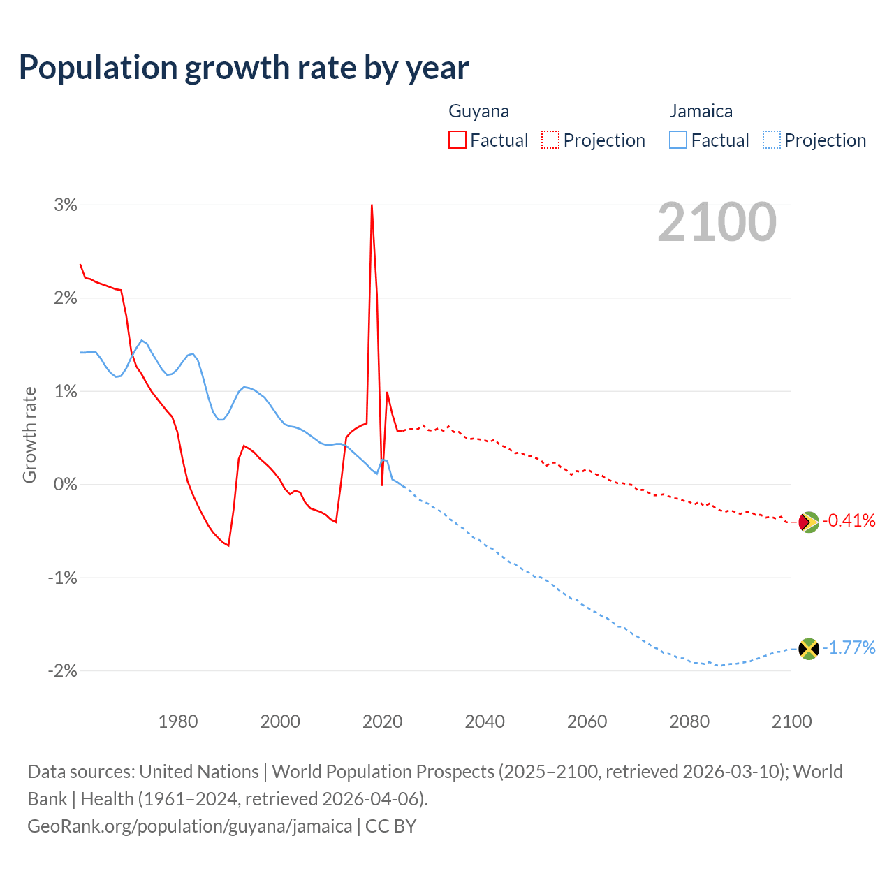- For the last 10 years, Guyana has had an average growth rate of +0.94% per year vs +0.18% in Jamaica.