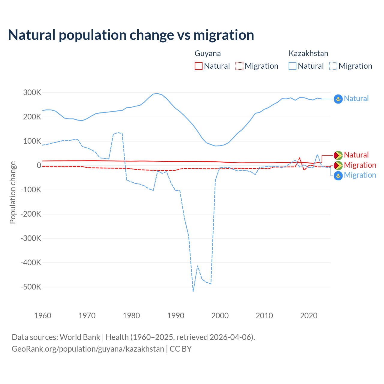 Over the last 10 years, 77.7% of the population change in Guyana is from natural causes (a gain of 107,419 people) and 22.3% is from migration (a loss of 30,797 people). In Kazakhstan 98.7% is from natural causes (a gain of 2,743,094 people) and 1.33% is from migration (a gain of 36,908 people).