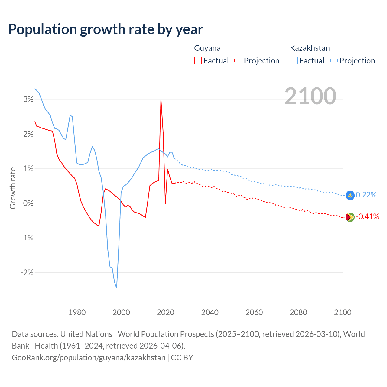 - For the last 10 years, Guyana has had an average growth rate of +0.94% per year vs +1.46% in Kazakhstan.