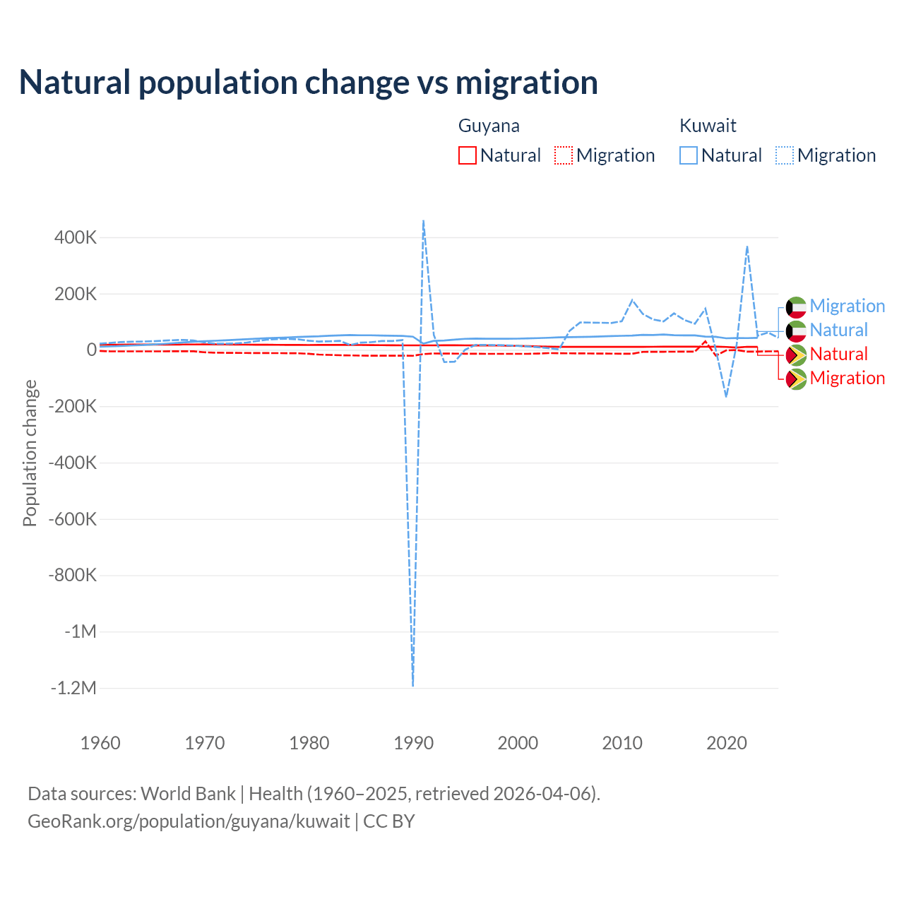 Over the last 10 years, 77.7% of the population change in Guyana is from natural causes (a gain of 107,419 people) and 22.3% is from migration (a loss of 30,797 people). In Kuwait 35.8% is from natural causes (a gain of 470,645 people) and 64.2% is from migration (a gain of 845,142 people).