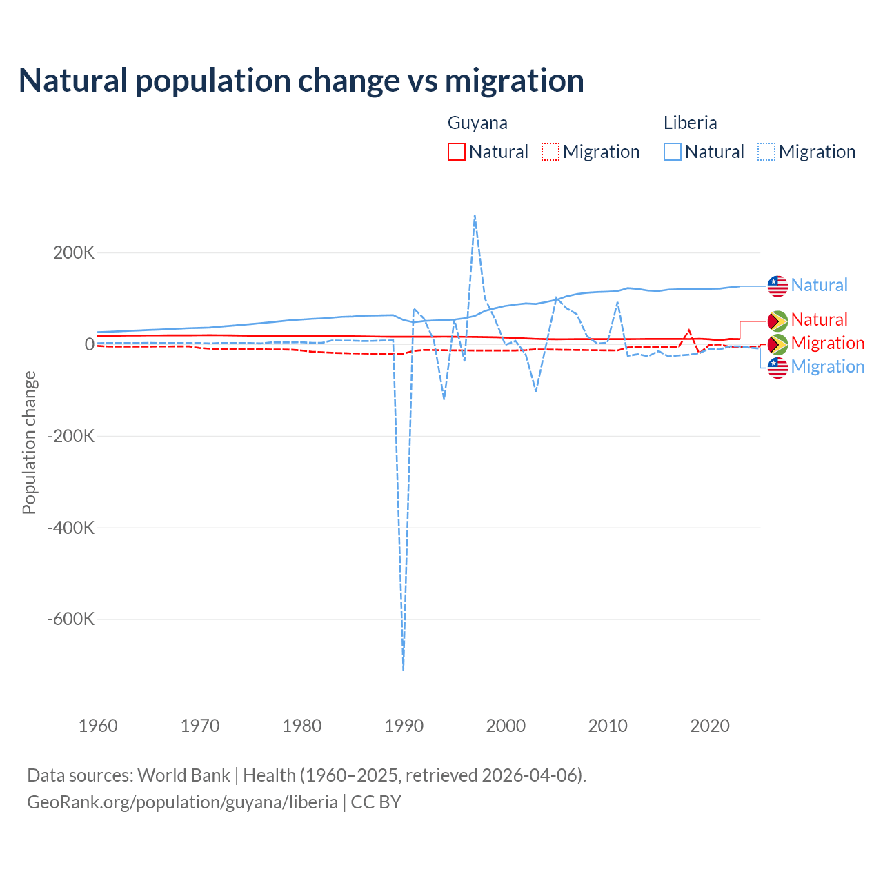 Over the last 10 years, 77.7% of the population change in Guyana is from natural causes (a gain of 107,419 people) and 22.3% is from migration (a loss of 30,797 people). In Liberia 87.7% is from natural causes (a gain of 1,202,387 people) and 12.3% is from migration (a loss of 168,316 people).