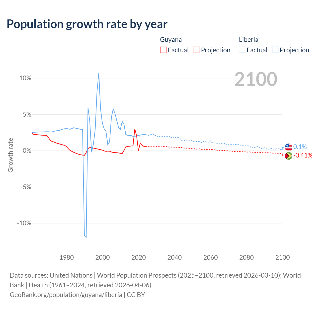 - For the last 10 years, Guyana has had an average growth rate of +0.94% per year vs +2.09% in Liberia.