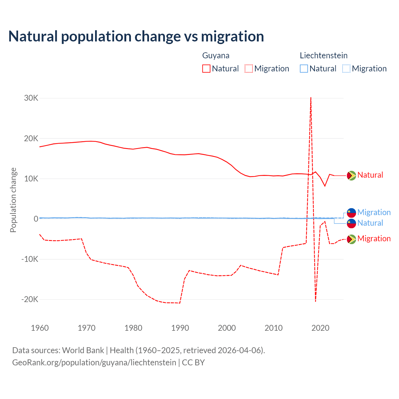 Over the last 10 years, 77.7% of the population change in Guyana is from natural causes (a gain of 107,419 people) and 22.3% is from migration (a loss of 30,797 people). In Liechtenstein 32.4% is from natural causes (a gain of 883 people) and 67.6% is from migration (a gain of 1,843 people).